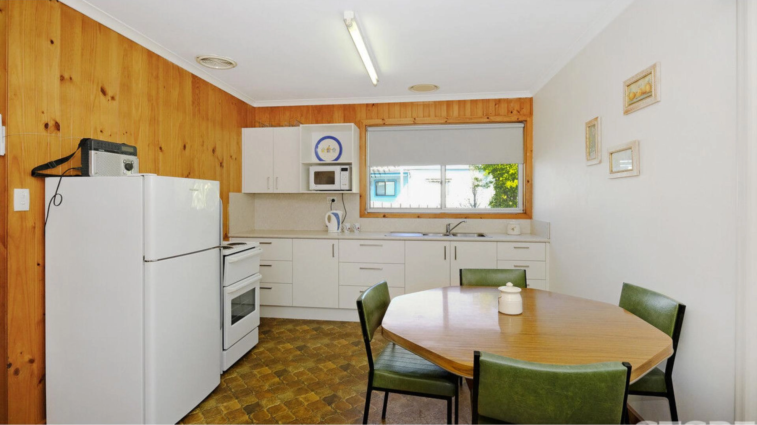 The unit is positioned at the end of a set of three units with a single car steel garage allocation. There is a large, covered veranda at the front of the unit with enough room for a BBQ and garden setting. Glass sliding doors invite you inside to an open plan area comprised of a lounge room, dining and kitchen with electric cooking. Pine lining clad the walls and vinyl covers the floors and a reverse cycle split system air-conditioner controls the temperature for all seasons. There is a large bedroom with built-in robes and a large window overlooking the front veranda. The bathroom has a vanity, shower and shelving and there is a separate toilet and laundry.